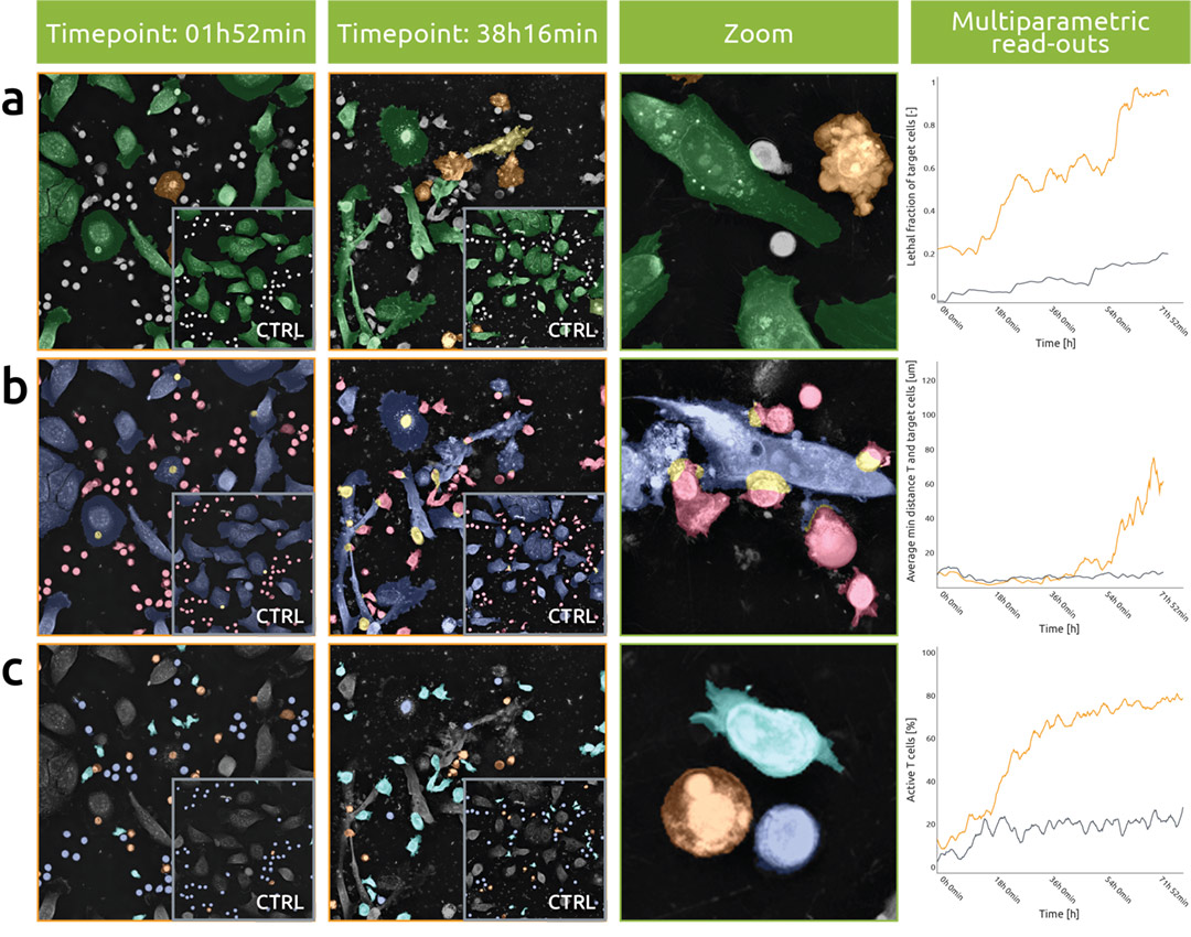 Digital segmentation of live (green) and dead (orange) target cells at different timepoints allows for quantification of lethal fraction over time (a). Additionally, target cells (blue), T cells (red) and their interaction points (yellow) can be digitally segmented for unique interaction metrics including the average minimum distance between T cells and target cells [um] against time (b). Finally, AI-predicted T cell activation status, including active T cells (cyan), inactive T cells (purple), and dead T cells (orange) can be shown through digital segmentation and quantified; here active cells [%] (per fov) against time (c).