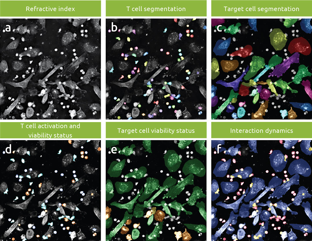 Label-free effector and target cell segmentation and interaction analysis. Nanolive’s refractive index holotomographic images of T and target cells in co-culture (a) with digital T-cell segmentation (b) and target cell segmentation overlays (c), T cell activation and viability status (d), target cell viability status (e) and cell interaction dynamics overlays (f). All colored digital overlays were applied following analysis with the LIVE T Cell Assay. Full legend below.