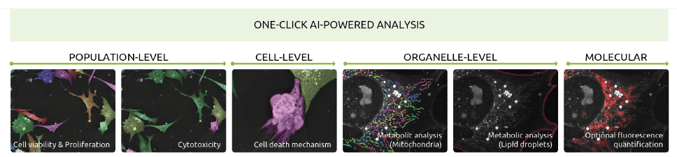 Nanolive imaging can be used to profile cell phenotypes at the organelle, cell, and population levels, and to cross-compare phenotypic metrics across biological dimensions (for example mitochondrial state, lipid organization, and overall cell health), including through integrated analyses. To download a 1-page guide to label-free cell painting, click here: Form: Label-free phenotyping angle one pager